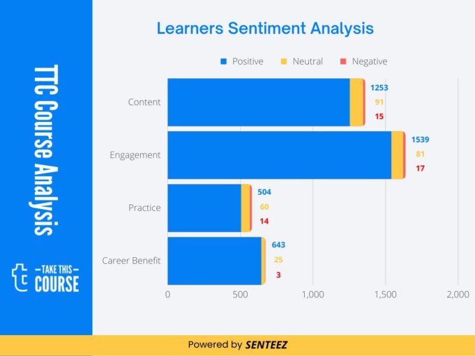 Below Stack Barchart further shows the positive, neutral and negative reviews we found during our detailed course analysis.