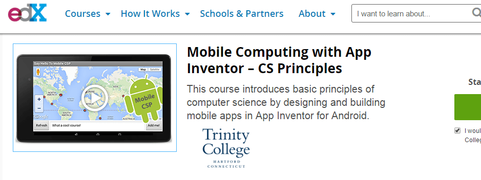 Learn to use the open development tool, App Inventor, to program on Android devices. You will learn how to design and build mobile apps — apps that are aware of their location, send and receive text messages, and give advice and directions. The only limit on the types of apps you will learn to build is your own imagination!